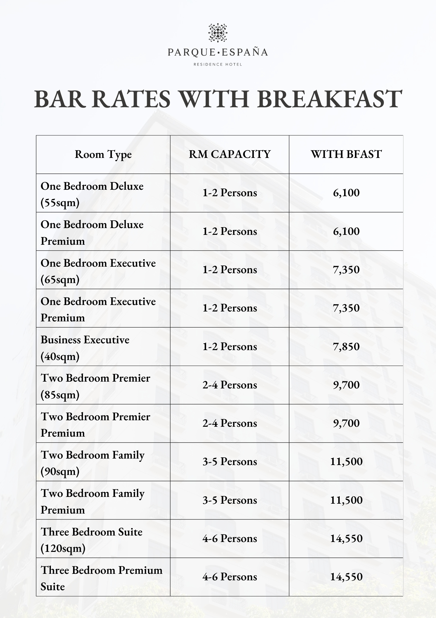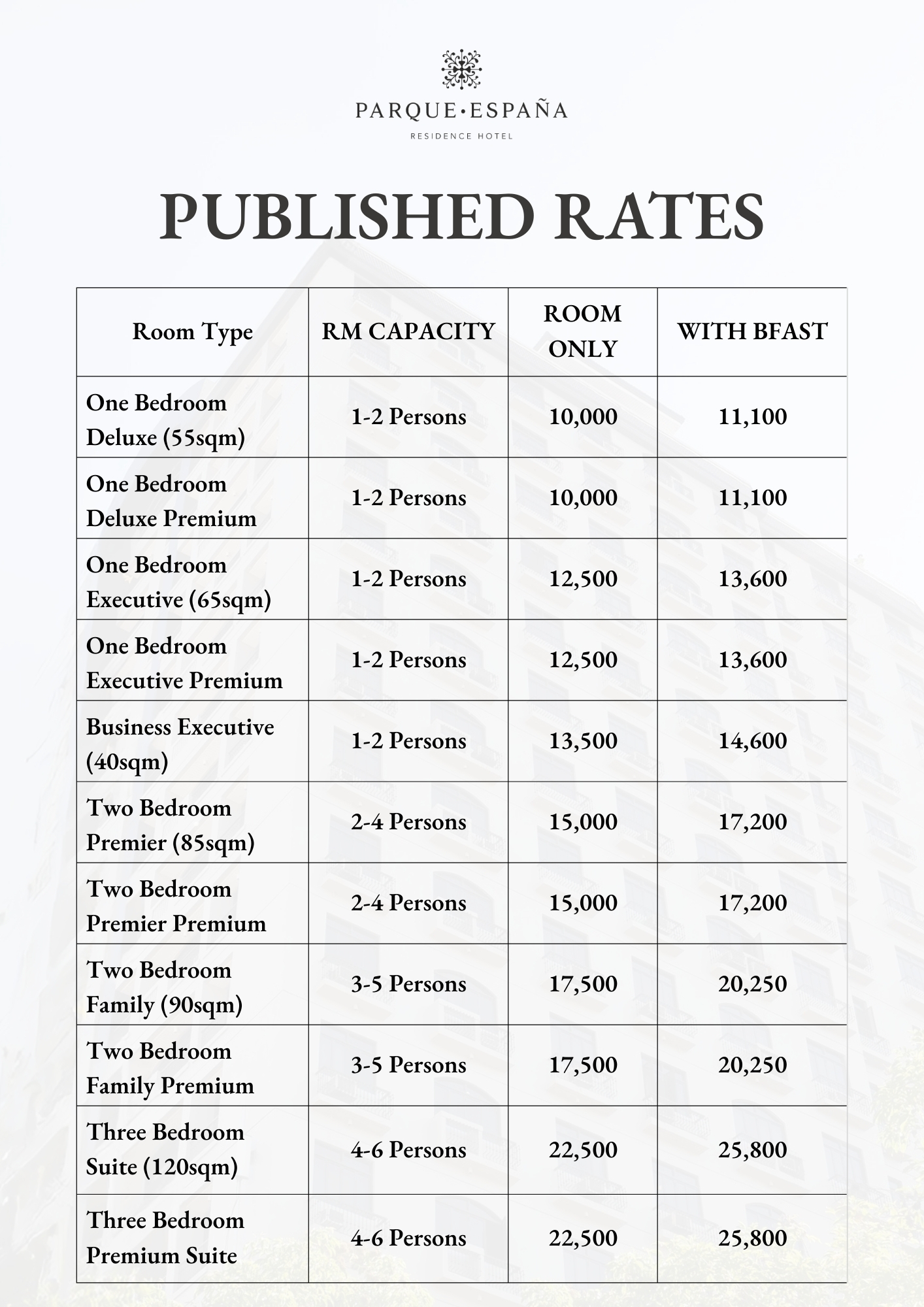 Rates are applicable per room, per night, based on the maximum occupancy indicated for each room type.