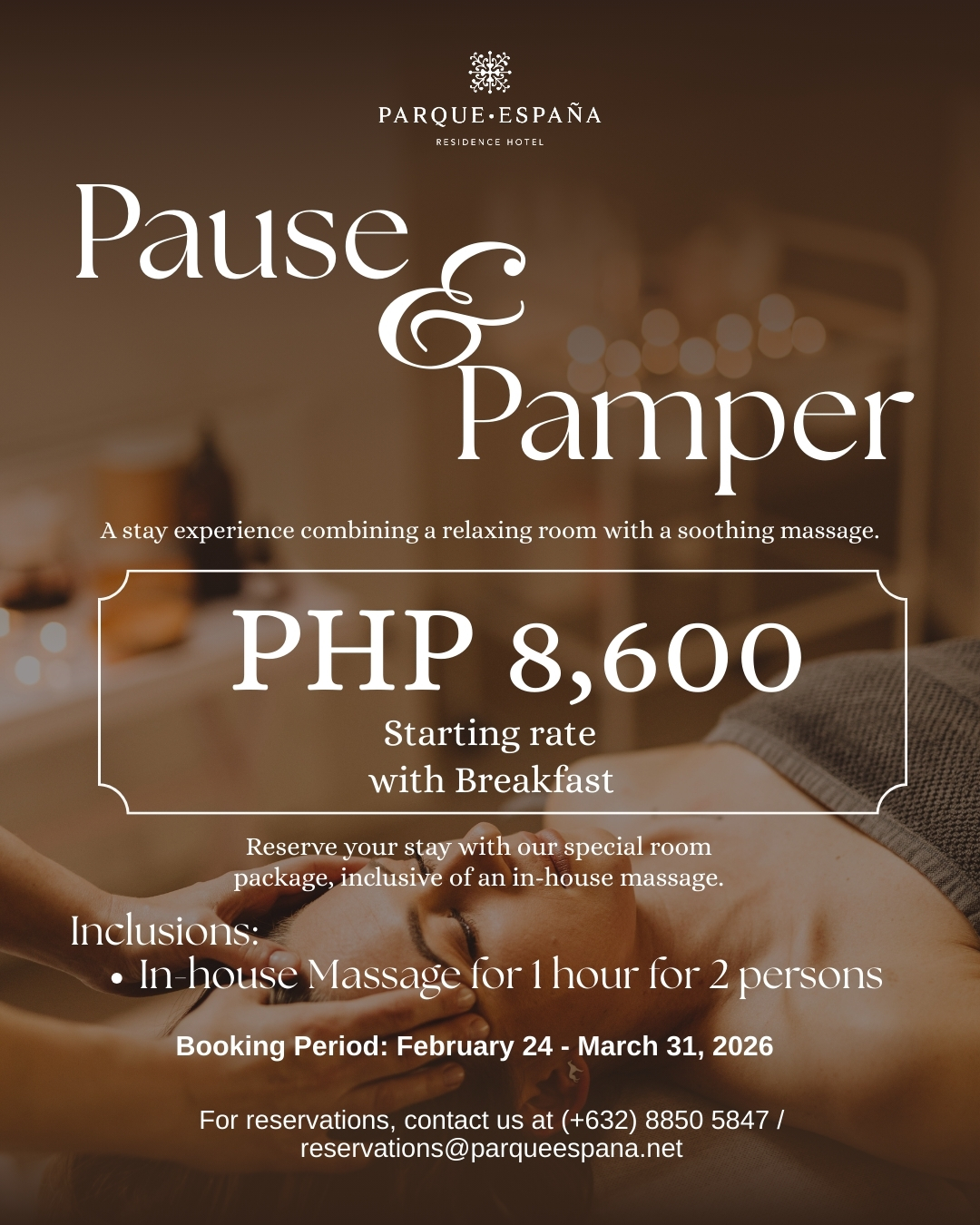 Rates are inclusive of overnight accommodation, daily breakfast buffet, and in-house massage for two (2) persons only.