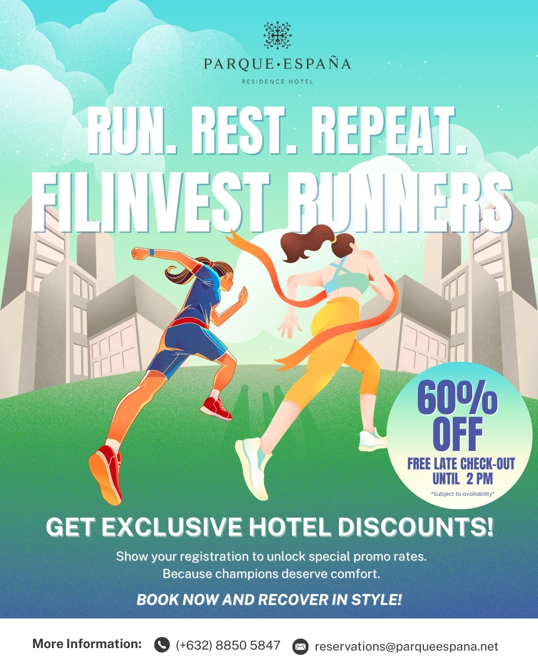 Offer is valid for registered Filinvest runners only. Valid race proof must be presented upon check-in to avail of the promo rate.